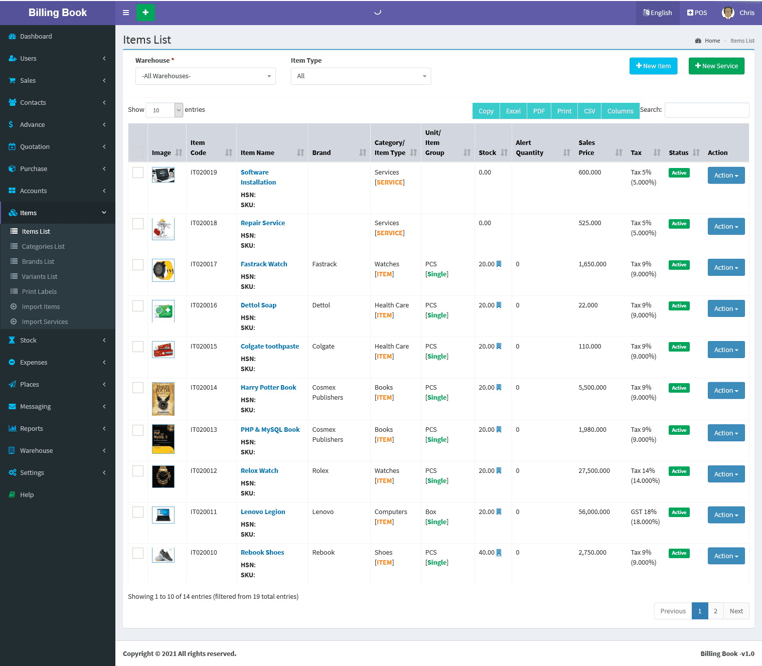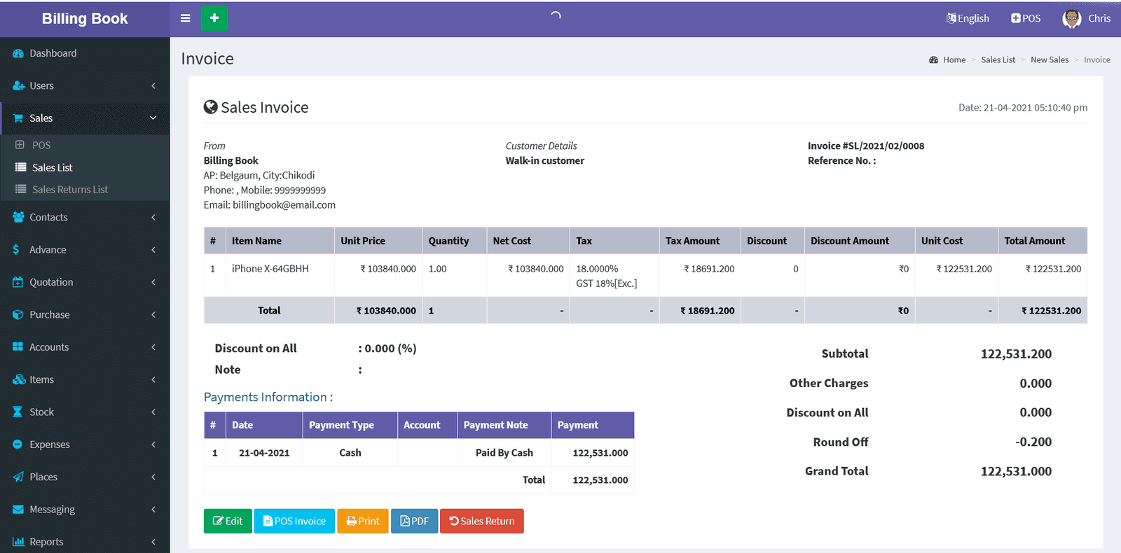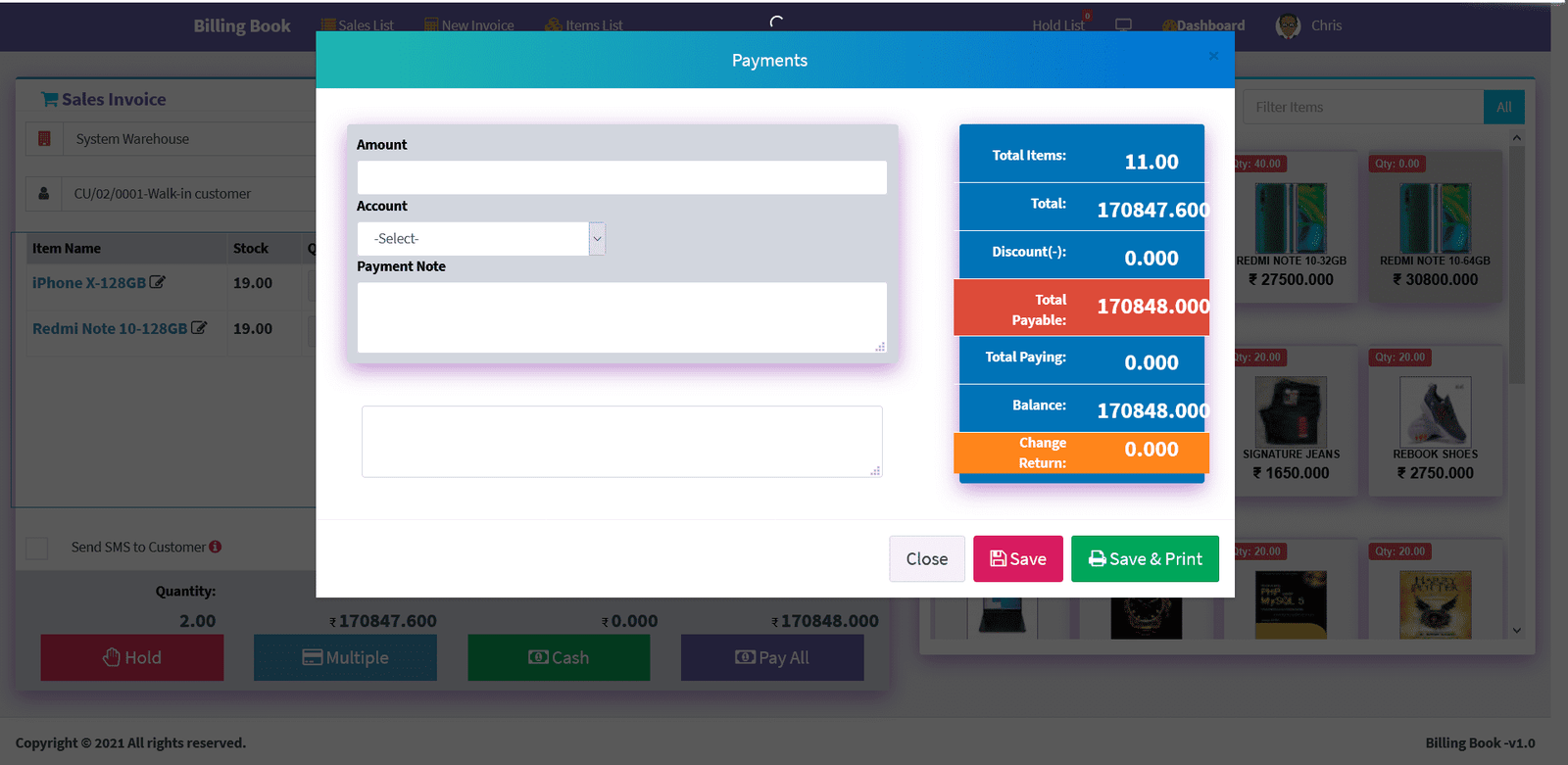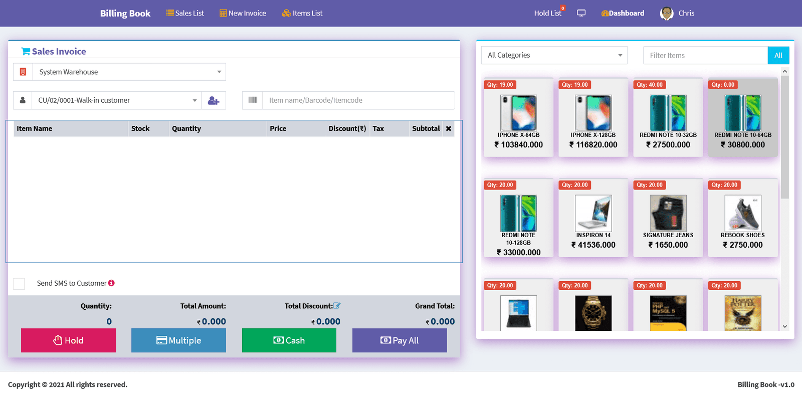 Billing Book is a PHP based web application software, where user can track and manage Items & Stock, Suppliers, Customers, Items Categories, Sales Invoice, Purchase Invoice, users and get all the reports which are require to your office with many more features. You can create any number of Warehouses and Users.