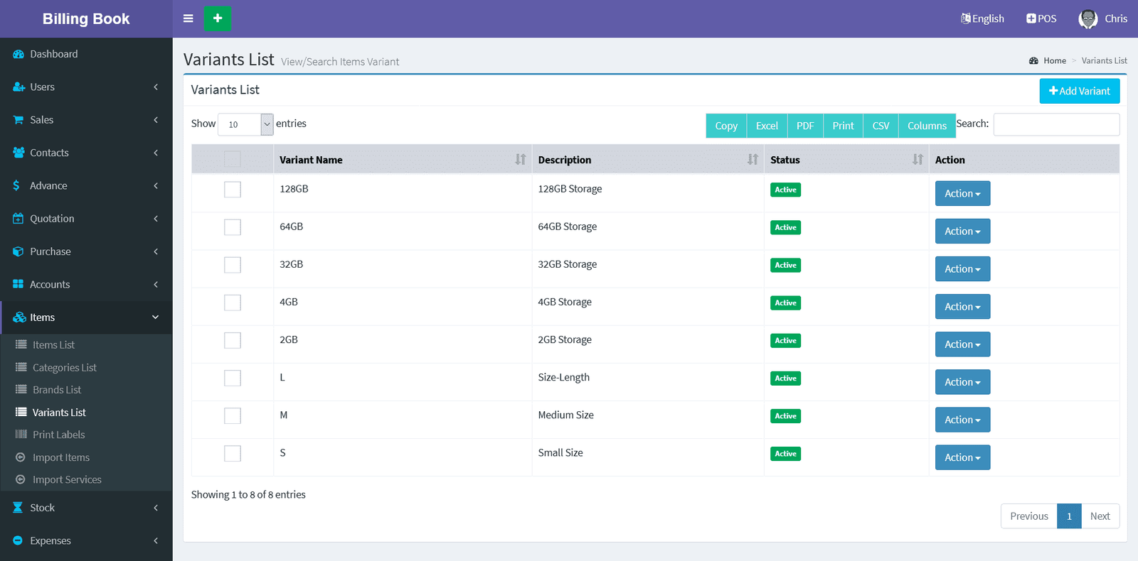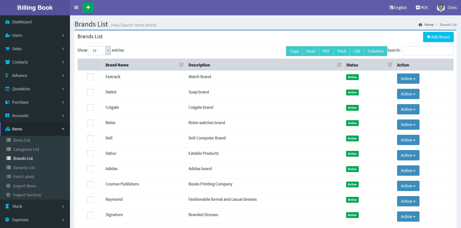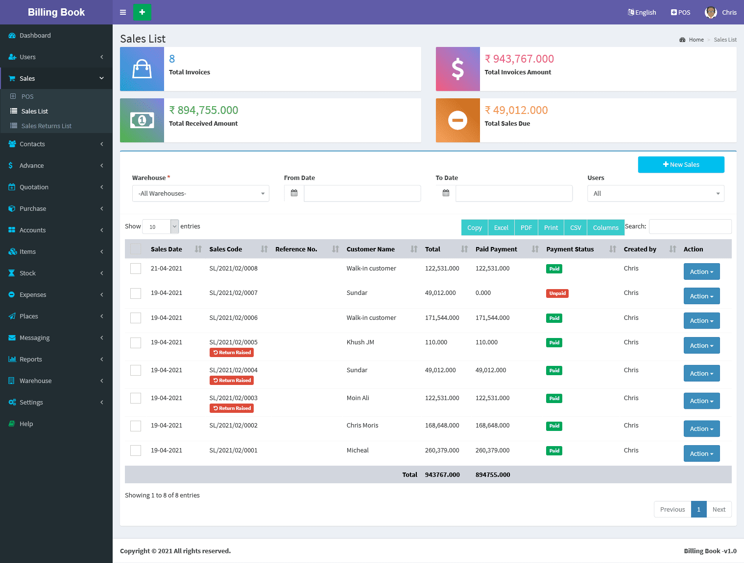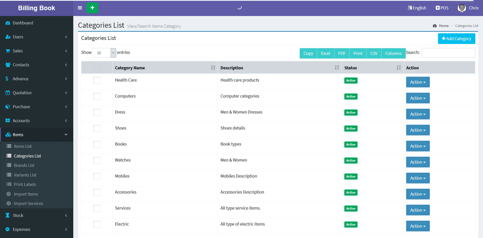 Billing Book is a PHP based web application software, where user can track and manage Items & Stock, Suppliers, Customers, Items Categories, Sales Invoice, Purchase Invoice, users and get all the reports which are require to your office with many more features. You can create any number of Warehouses and Users.