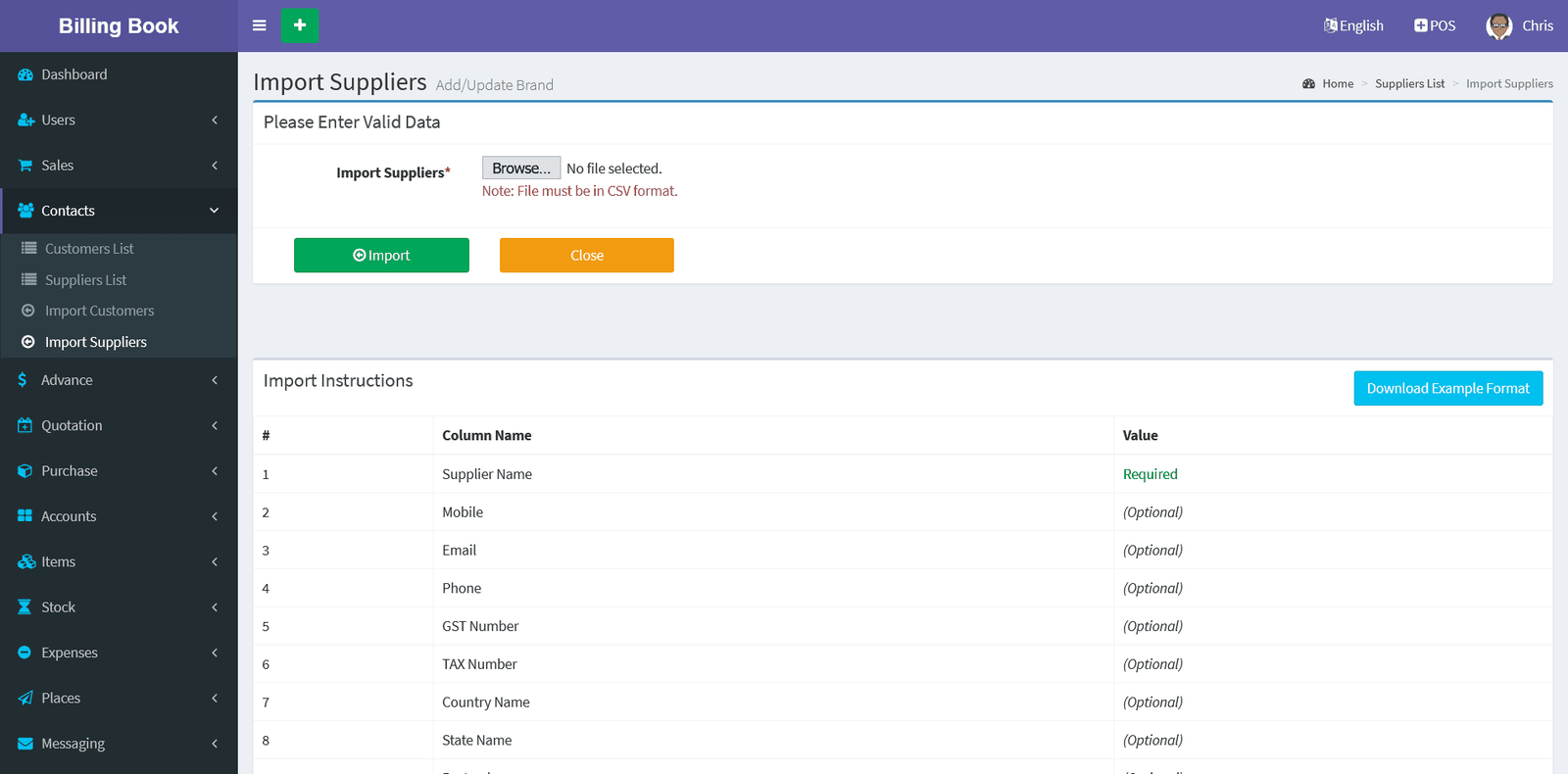 Suppliers -> Import Supplier