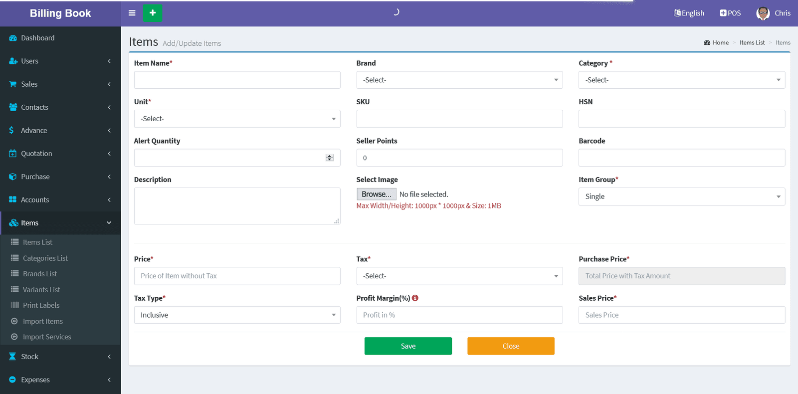 Adding a Items it's a very easy task. Enter Item name, Select Category, Unit, SKU(Optional Field), Alert Quantity(Optional field), Select Image(Optional field),Purchase Price(Without Tax), Select Tax, Tax Type(Inclusive / Exclusive), Profit Margin(in Percentage %) , Available/Current Stock(+/-) (Optional Field), Add Lot number(Optional), Expired Date(Optional) and click on Save button.