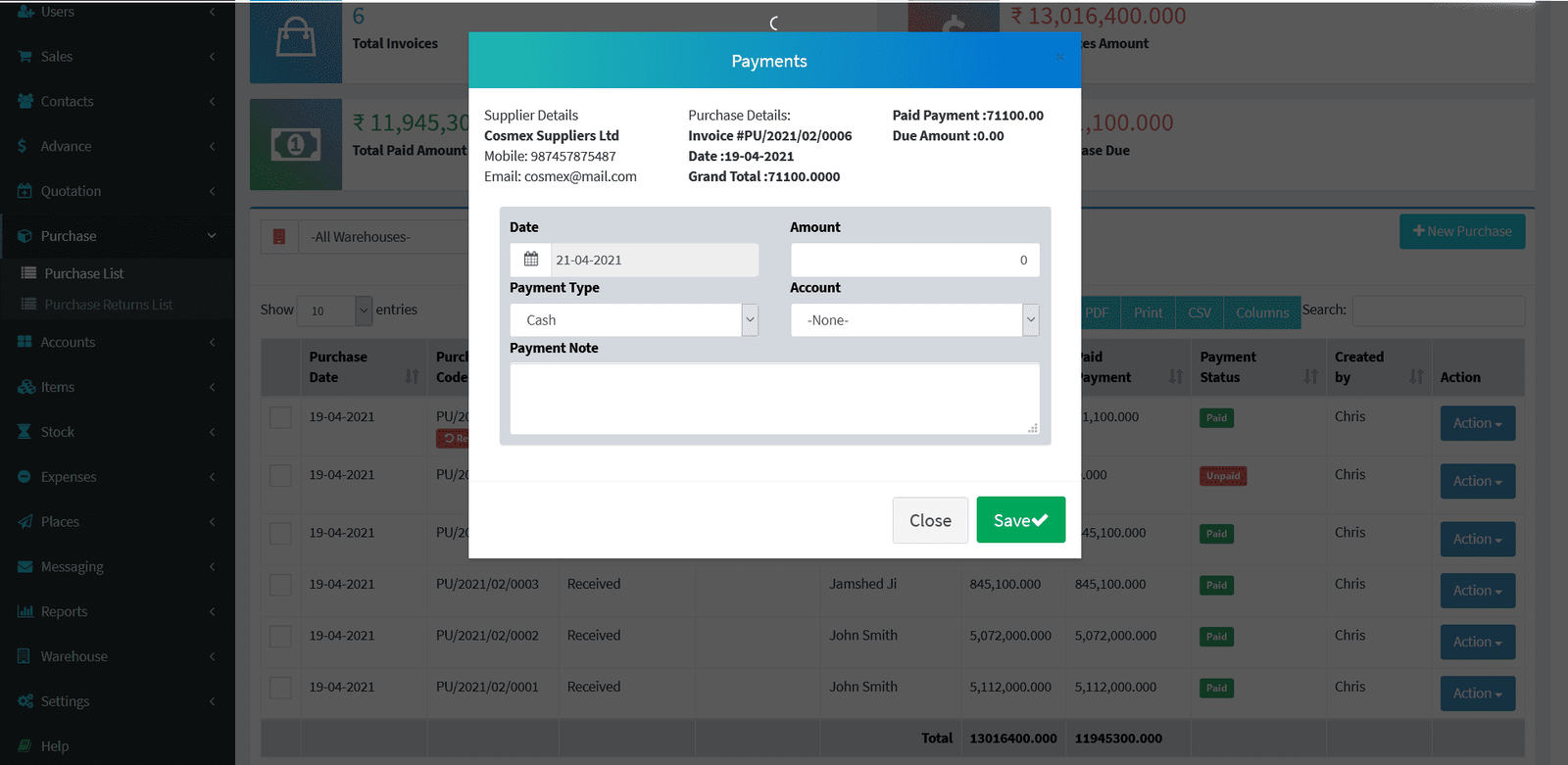 Suppliers -> Suppliers List -> Action Button -> Due Payments