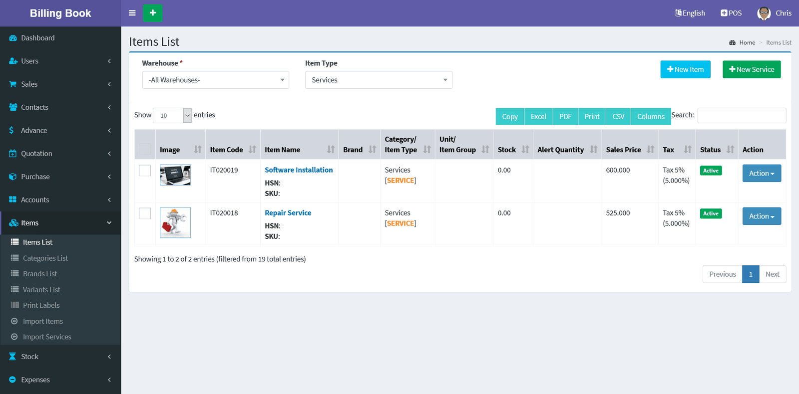 You can view the all the added Items/Services list and you can manage Items/Services list by Delete & Edit actions.