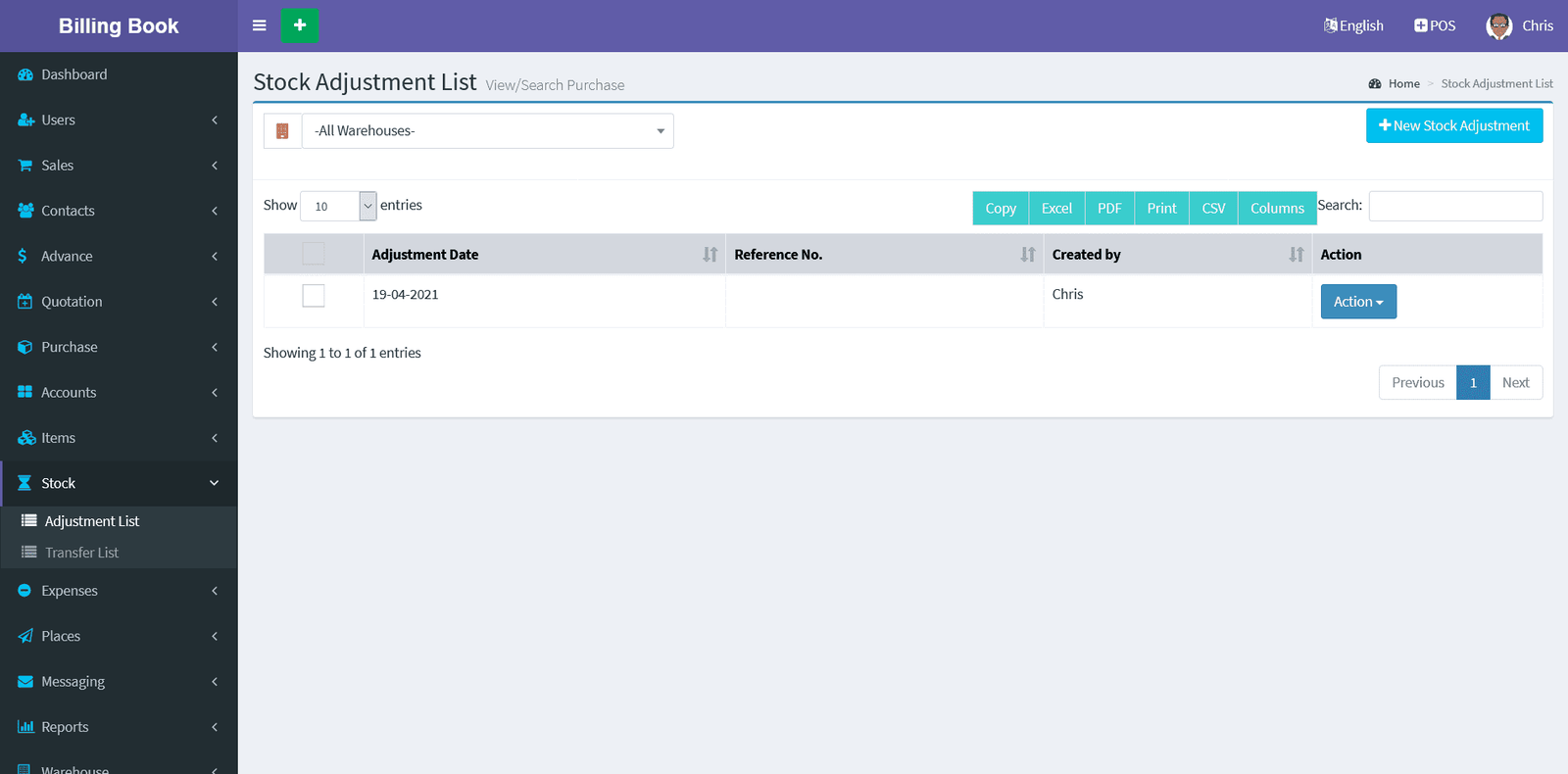 Left Sidebar -> Stock Adjustment -> Stock Adjustment List
