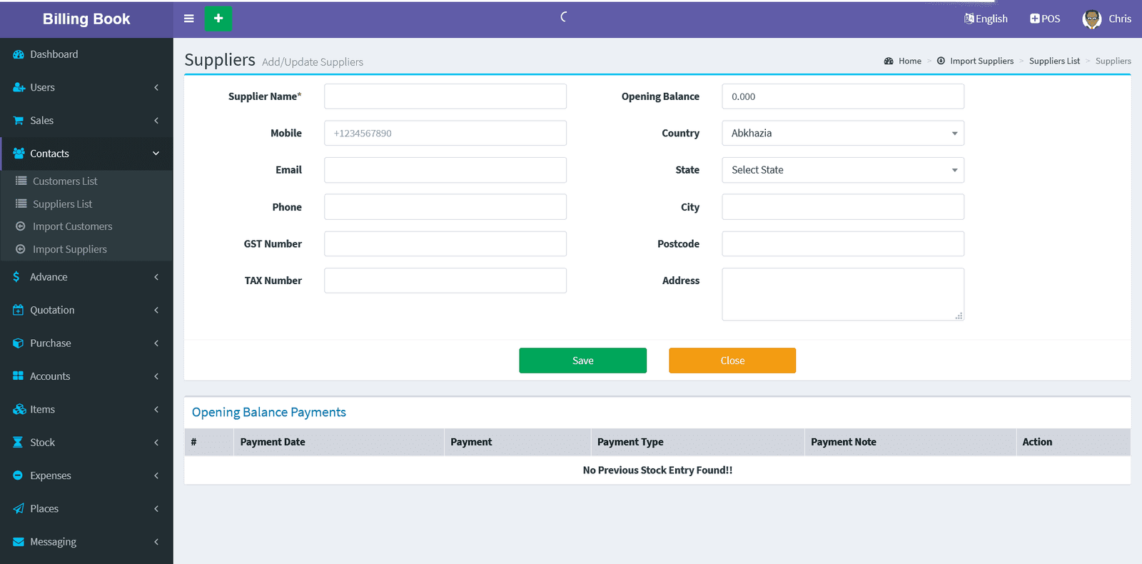 Adding a Suppliers it's a very easy task. Enter Supplier name, Mobile, Phone, Email, GST Number, TAX Number,