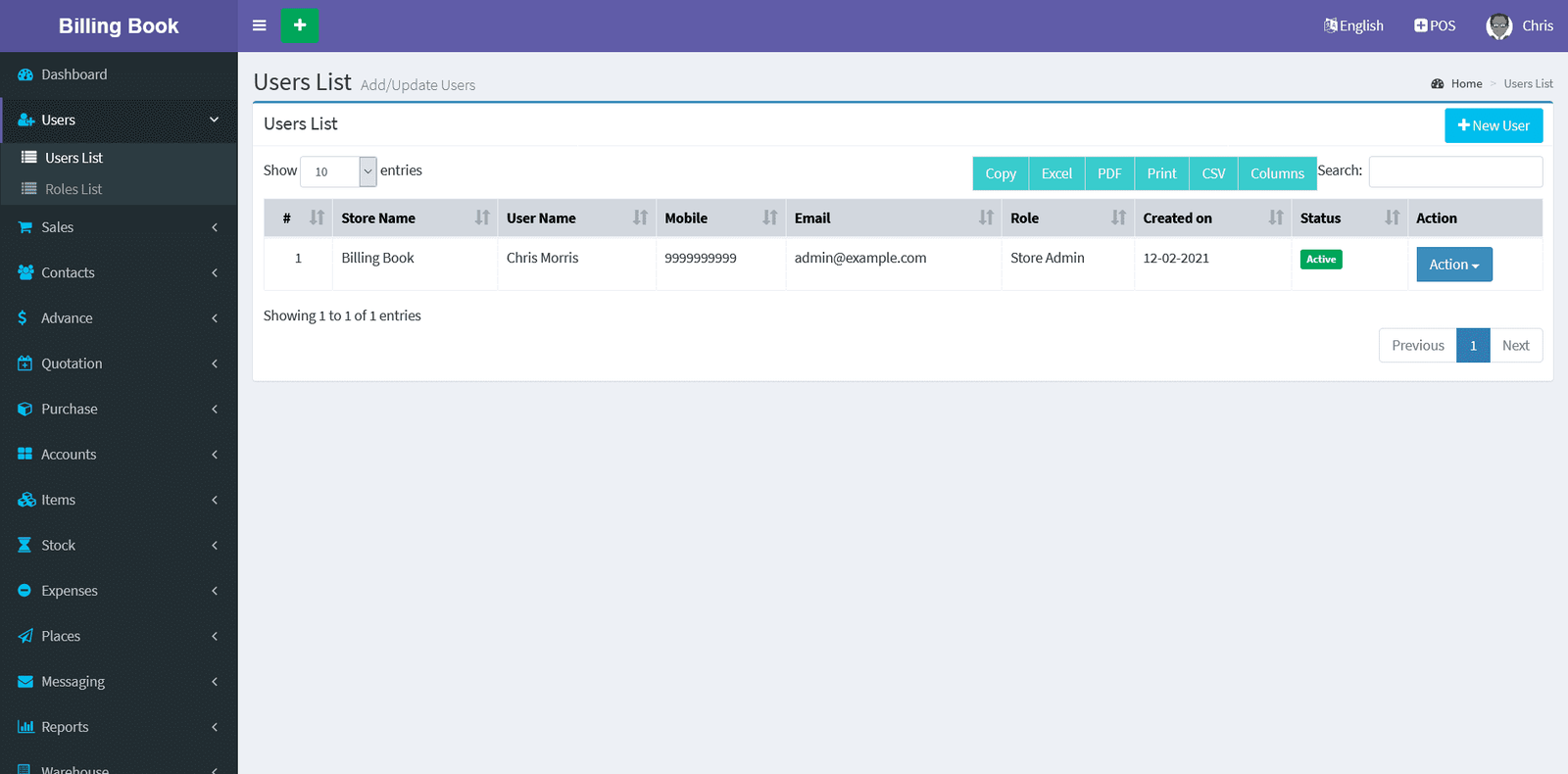 Adding a User it's a very easy task. Enter user name, Mobile number, Email ID, Role(Admin/Sales/Purchase), enter password and confirm the password fields of the new user and click on Save button.